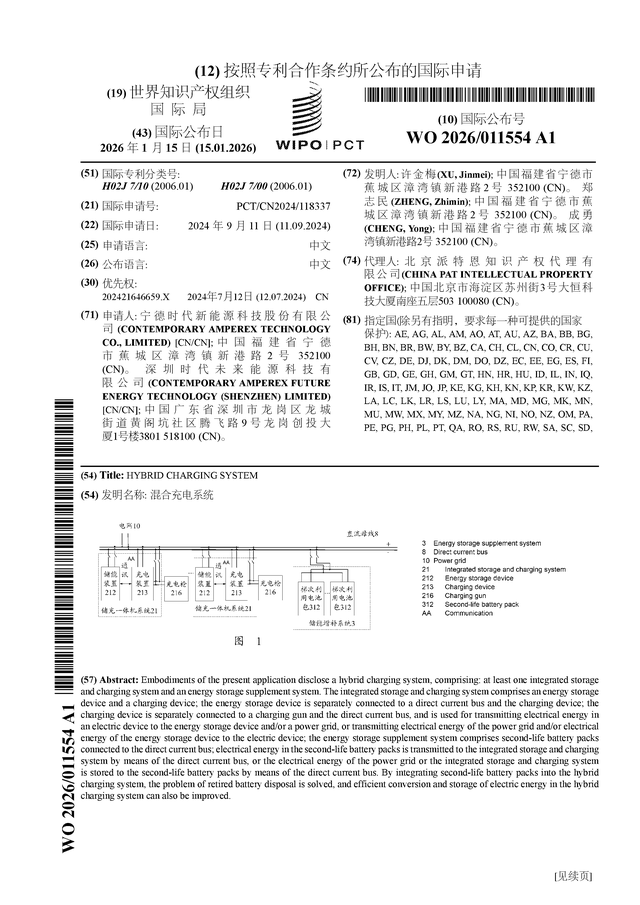 证券之星消息,根据企查查数据显示宁德时代(300750)公布了一项国际专利申请,专利名为“混合充电系统”,专利申请号为PCT/CN2024/118337,国际公布日为2026年1月15日。