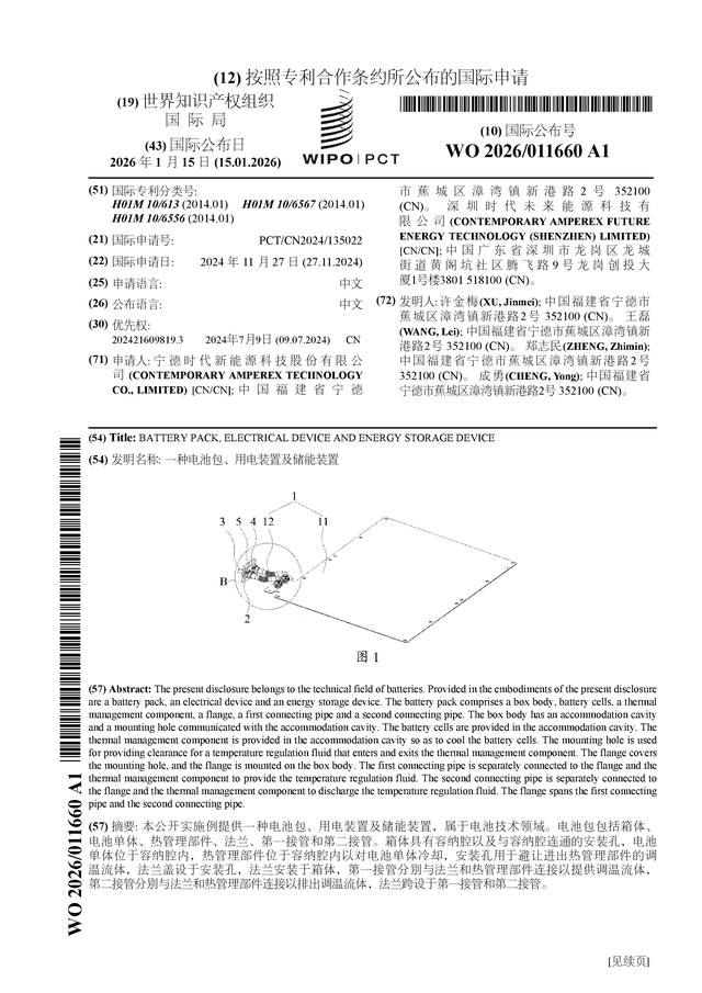 证券之星消息,根据企查查数据显示宁德时代(300750)公布了一项国际专利申请,专利名为“一种电池包、用电装置及储能装置”,专利申请号为PCT/CN2024/135022,国际公布日为2026年1月15日。