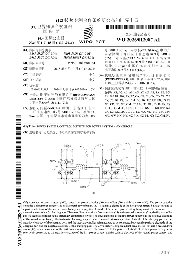 证券之星消息,根据企查查数据显示比亚迪(002594)公布了一项国际专利申请,专利名为“动力系统、动力系统的控制方法和车辆”,专利申请号为PCT/CN2025/102134,国际公布日为2026年1月15日。
