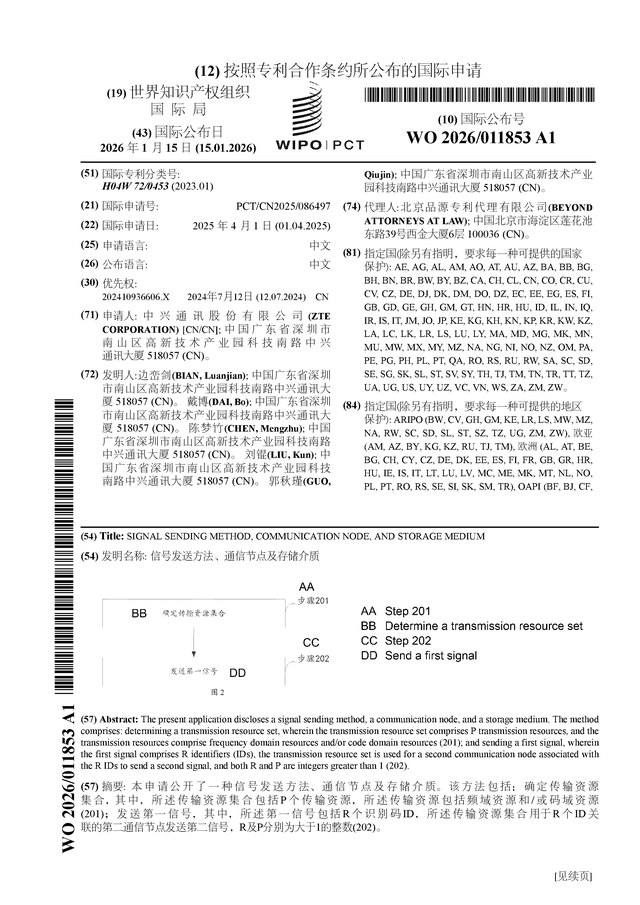 证券之星消息,根据企查查数据显示中兴通讯(000063)公布了一项国际专利申请,专利名为“信号发送方法、通信节点及存储介质”,专利申请号为PCT/CN2025/086497,国际公布日为2026年1月15日。
