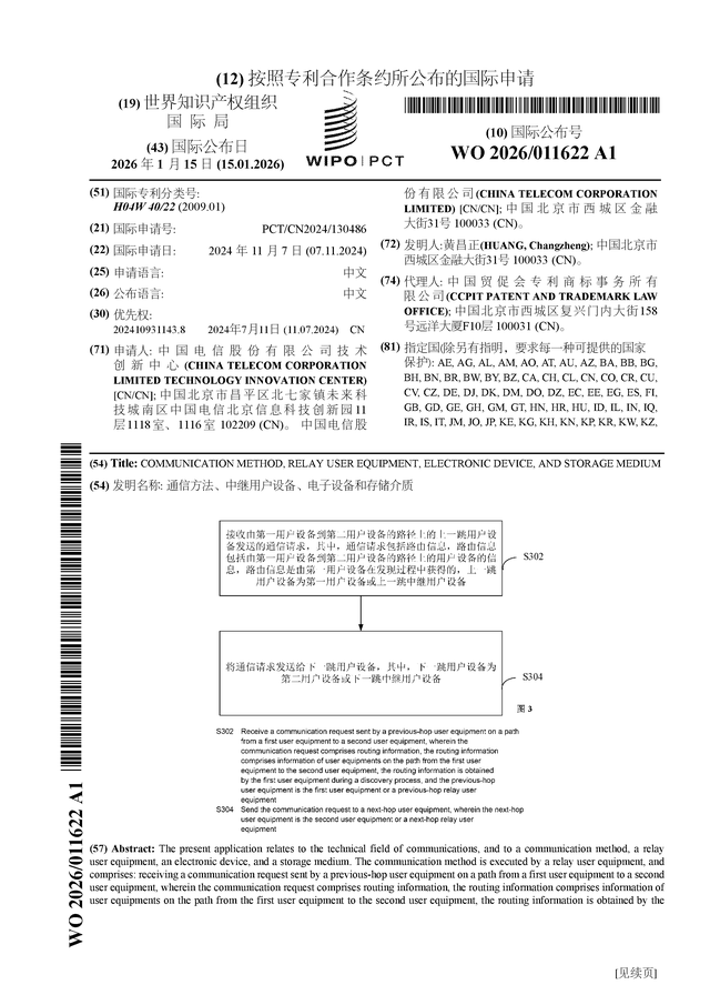 证券之星消息,根据企查查数据显示中国电信(601728)公布了一项国际专利申请,专利名为“通信方法、中继用户设备、电子设备和存储介质”,专利申请号为PCT/CN2024/130486,国际公布日为2026年1月15日。