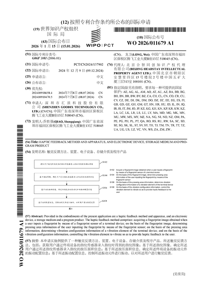 证券之星消息,根据企查查数据显示汇顶科技(603160)公布了一项国际专利申请,专利名为“触觉反馈方法、装置、电子设备、存储介质及程序产品”,专利申请号为PCT/CN2024/137902,国际公布日为2026年1月15日。