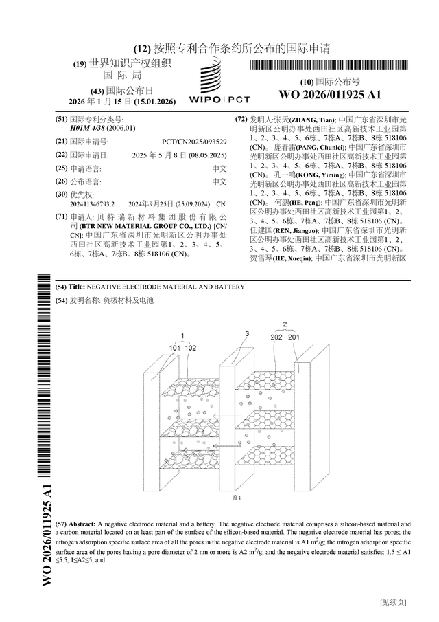 证券之星消息,根据企查查数据显示贝特瑞(920185)公布了一项国际专利申请,专利名为“负极材料及电池”,专利申请号为PCT/CN2025/093529,国际公布日为2026年1月15日。