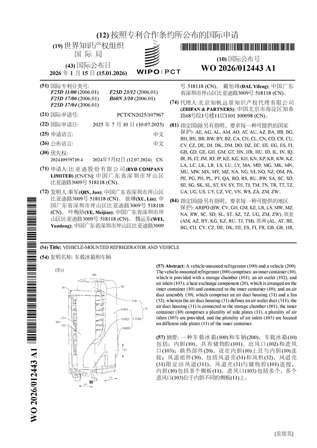 证券之星消息,根据企查查数据显示比亚迪(002594)公布了一项国际专利申请,专利名为“车载冰箱和车辆”,专利申请号为PCT/CN2025/107967,国际公布日为2026年1月15日。