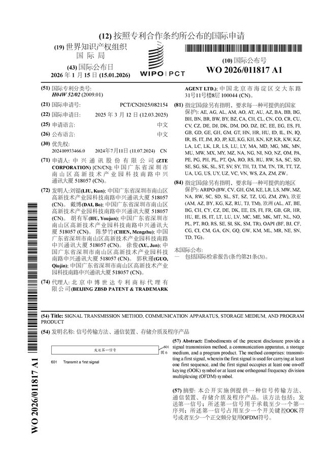证券之星消息,根据企查查数据显示中兴通讯(000063)公布了一项国际专利申请,专利名为“信号传输方法、通信装置、存储介质及程序产品”,专利申请号为PCT/CN2025/082154,国际公布日为2026年1月15日。