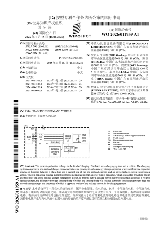 证券之星消息,根据企查查数据显示比亚迪(002594)公布了一项国际专利申请,专利名为“充电系统和车辆”,专利申请号为PCT/CN2025/095365,国际公布日为2026年1月15日。