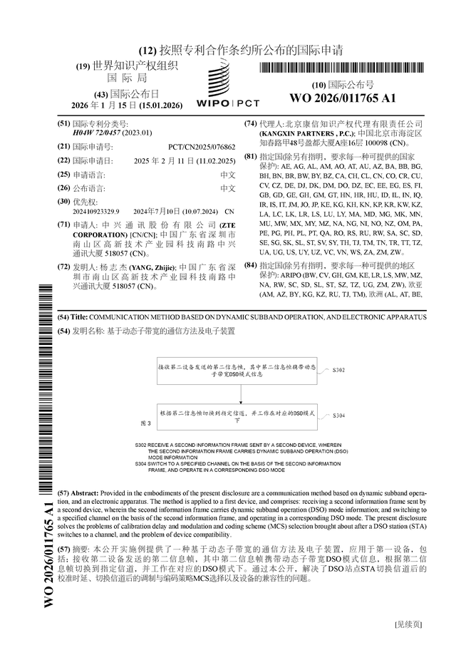 证券之星消息,根据企查查数据显示中兴通讯(000063)公布了一项国际专利申请,专利名为“基于动态子带宽的通信方法及电子装置”,专利申请号为PCT/CN2025/076862,国际公布日为2026年1月15日。
