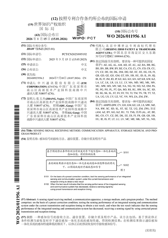 证券之星消息,根据企查查数据显示中兴通讯(000063)公布了一项国际专利申请,专利名为“感知信号的接收方法、通信装置、存储介质及程序产品”,专利申请号为PCT/CN2025/095192,国际公布日为2026年1月15日。