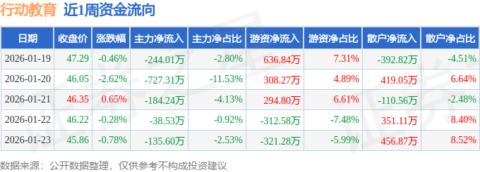 资金流向数据方面,本周行动教育主力资金合计净流出1329.69万元,游资资金合计净流入606.05万元,散户资金合计净流入723.65万元。本周资金流向一览见下表: