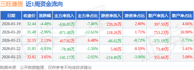 资金流向数据方面,本周三旺通信主力资金合计净流出1310.18万元,游资资金合计净流入101.41万元,散户资金合计净流入1208.77万元。本周资金流向一览见下表:
