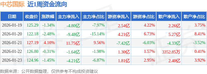 证券之星消息,截至2026年1月23日收盘,中芯国际(688981)报收于124.96元,较上周的126.99元下跌1.6%。本周,中芯国际1月22日盘中最高价报130.82元。1月21日盘中最低价报120.58元。中芯国际当前最新总市值9997.35亿元,在半导体板块市值排名1/170,在两市A股市值排名13/5182。