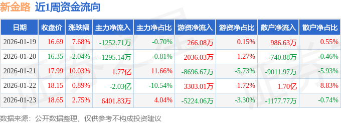 资金流向数据方面,本周新金路主力资金合计净流入1299.83万元,游资资金合计净流出8315.61万元,散户资金合计净流入7015.78万元。本周资金流向一览见下表: