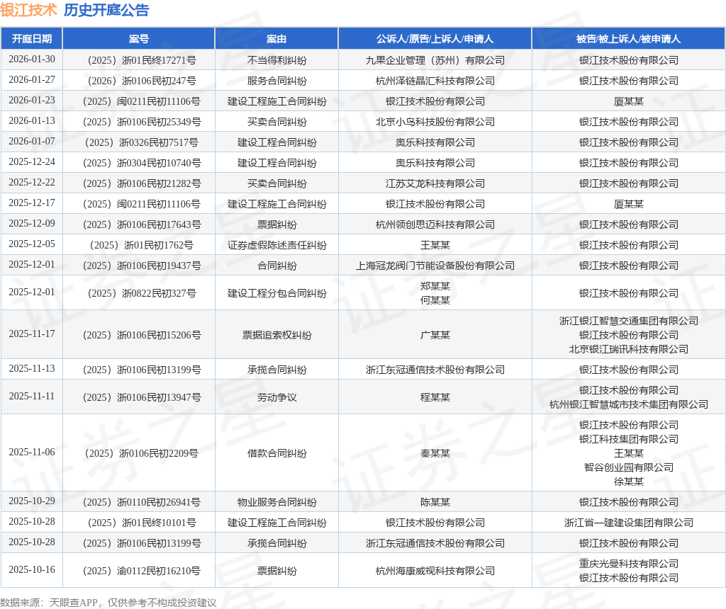 案号:(2026)浙0106民初247号根据统计,近一年内以银江技术股份有限公司为当事人的历史开庭公告有88则,其中案由为“合同纠纷”的公告以12则居首,其次为“票据追索权纠纷”有12则,“票据纠纷”有6则。历史开庭公告(前20条)如下: