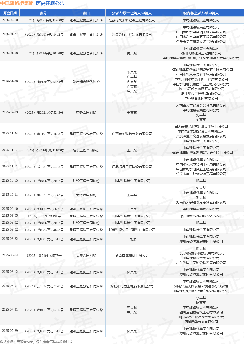案号:(2025)浙1081民初5432号根据统计,近一年内以中电建路桥集团有限公司为当事人的历史开庭公告有46则,其中案由为“建设工程施工合同纠纷”的公告以21则居首,其次为“建设工程分包合同纠纷”有6则,“财产损害赔偿纠纷”有6则。历史开庭公告(前20条)如下: