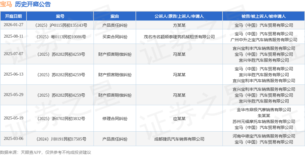 案号:(2025)沪0115民初135143号根据统计,近一年内以宝马(中国)汽车贸易有限公司为当事人的历史开庭公告有7则,其中案由为“财产损害赔偿纠纷”的公告以3则居首,其次为“产品责任纠纷”有2则,“买卖合同纠纷”有1则。历史开庭公告如下: