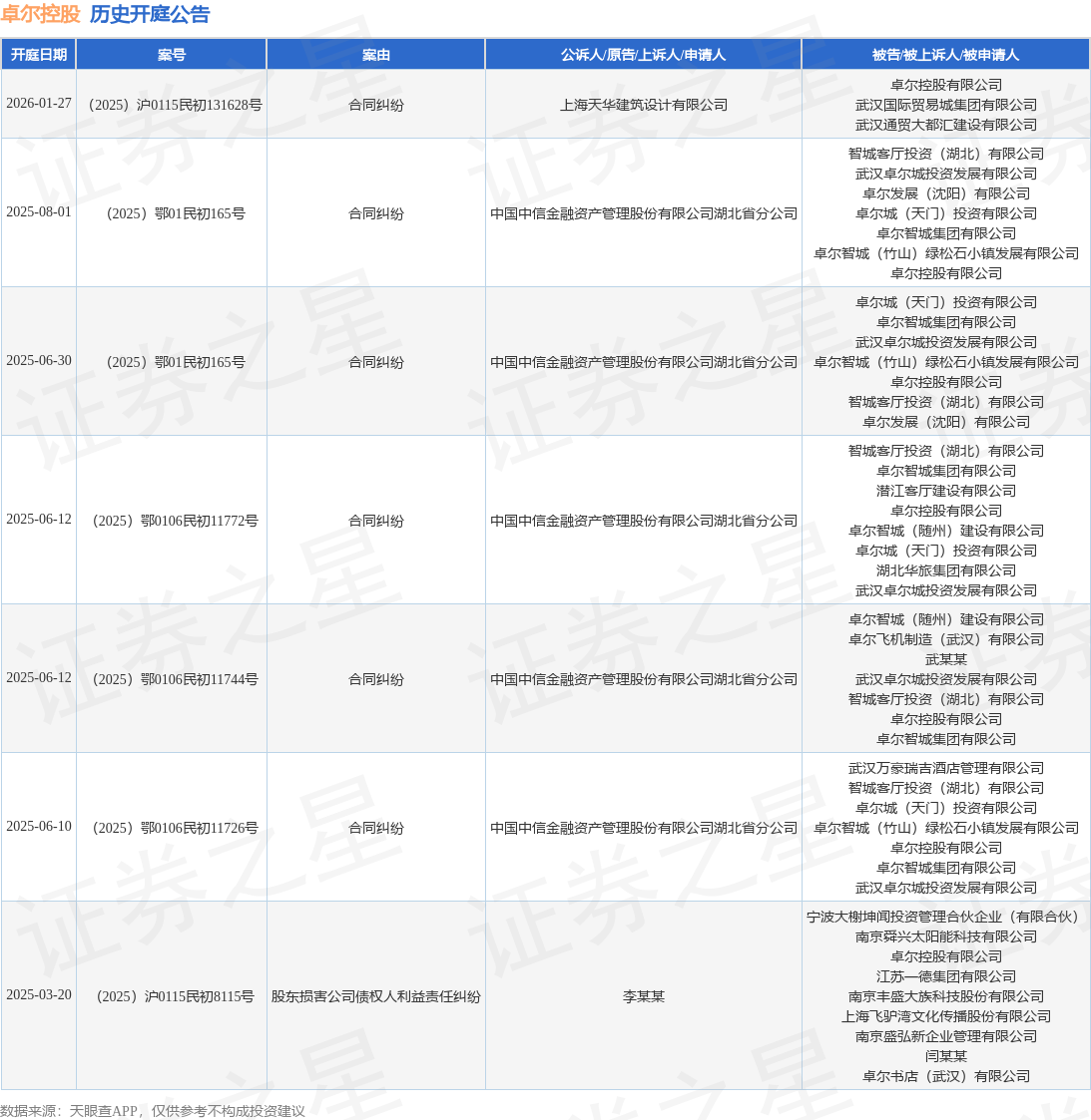 根据统计,近一年内以卓尔控股有限公司为当事人的历史开庭公告有7则,其中案由为“合同纠纷”的公告以6则居首,其次为“股东损害公司债权人利益责任纠纷”有1则。历史开庭公告如下: