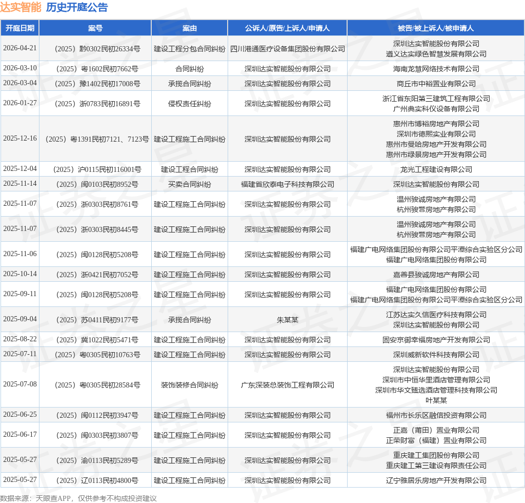 案号:(2025)浙0783民初16891号根据统计,近一年内以深圳达实智能股份有限公司为当事人的历史开庭公告有39则,其中案由为“建设工程施工合同纠纷”的公告以18则居首,其次为“买卖合同纠纷”有3则,“建设工程合同纠纷”有3则。历史开庭公告(前20条)如下: