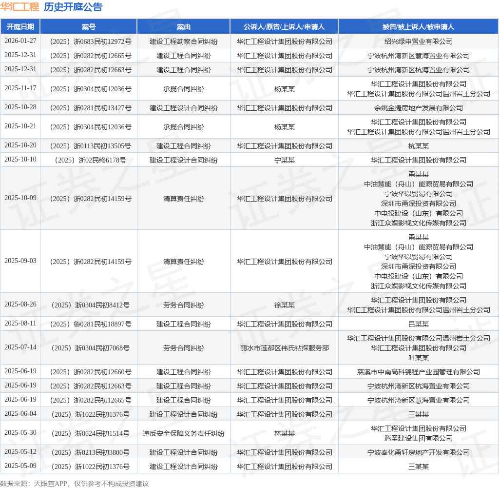 案号:(2025)浙0683民初12972号根据统计,近一年内以华汇工程设计集团股份有限公司为当事人的历史开庭公告有22则,其中案由为“建设工程合同纠纷”的公告以8则居首,其次为“建设工程设计合同纠纷”有6则,“劳务合同纠纷”有2则。历史开庭公告(前20条)如下: