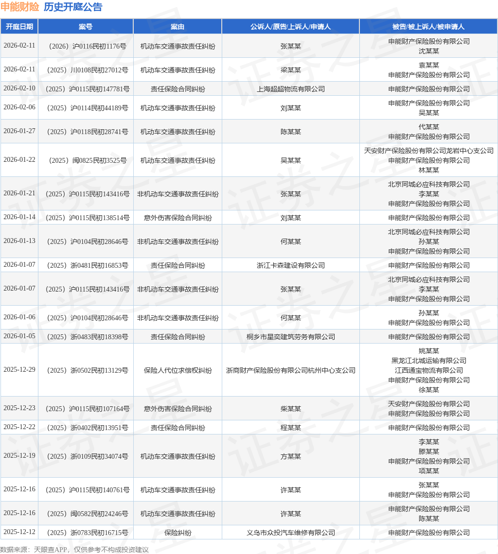 案号:(2025)沪0118民初28741号根据统计,近一年内以申能财产保险股份有限公司为当事人的历史开庭公告有89则,其中案由为“机动车交通事故责任纠纷”的公告以47则居首,其次为“责任保险合同纠纷”有12则,“非机动车交通事故责任纠纷”有9则。历史开庭公告(前20条)如下:
