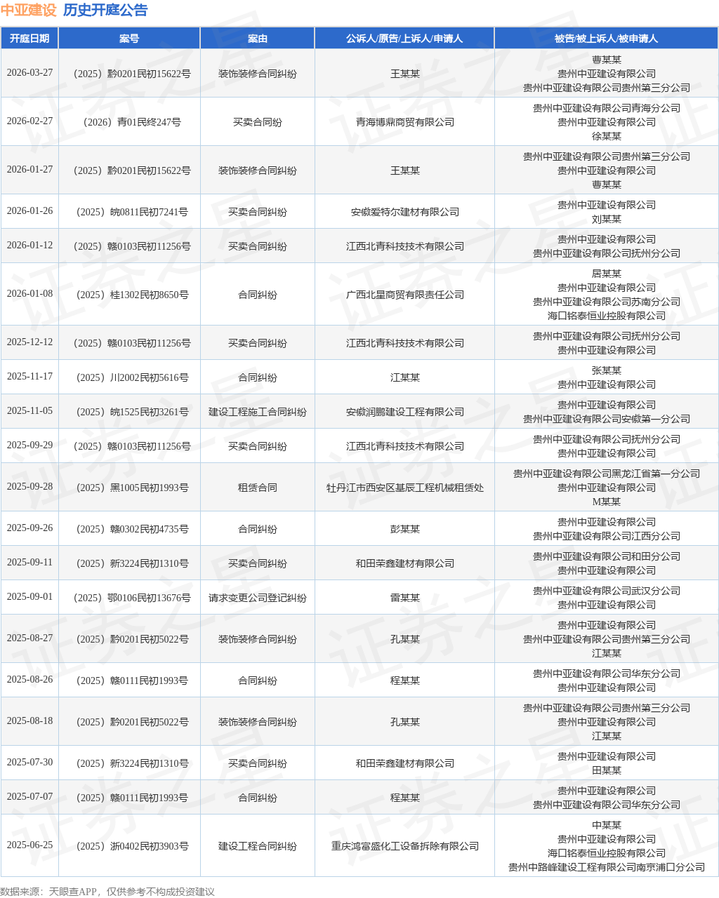 案号:(2025)黔0201民初15622号根据统计,近一年内以贵州中亚建设有限公司为当事人的历史开庭公告有37则,其中案由为“买卖合同纠纷”的公告以7则居首,其次为“建设工程合同纠纷”有6则,“合同纠纷”有5则。历史开庭公告(前20条)如下: