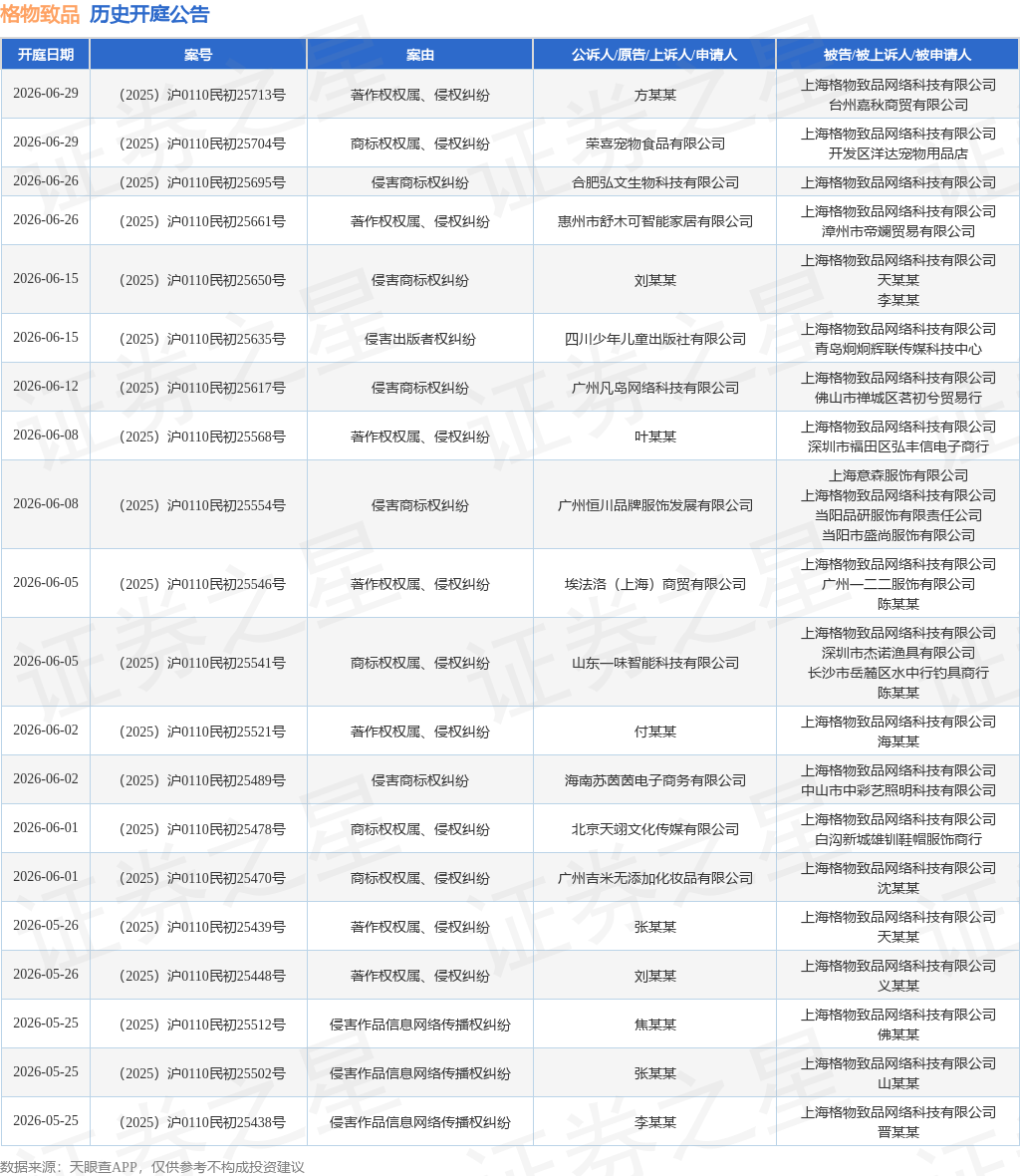 案号:(2025)苏0602民14659号根据统计,近一年内以上海格物致品网络科技有限公司为当事人的历史开庭公告有3868则,其中案由为“侵害外观设计专利权纠纷”的公告以861则居首,其次为“侵害商标权纠纷”有785则,“著作权权属、侵权纠纷”有639则。历史开庭公告(前20条)如下: