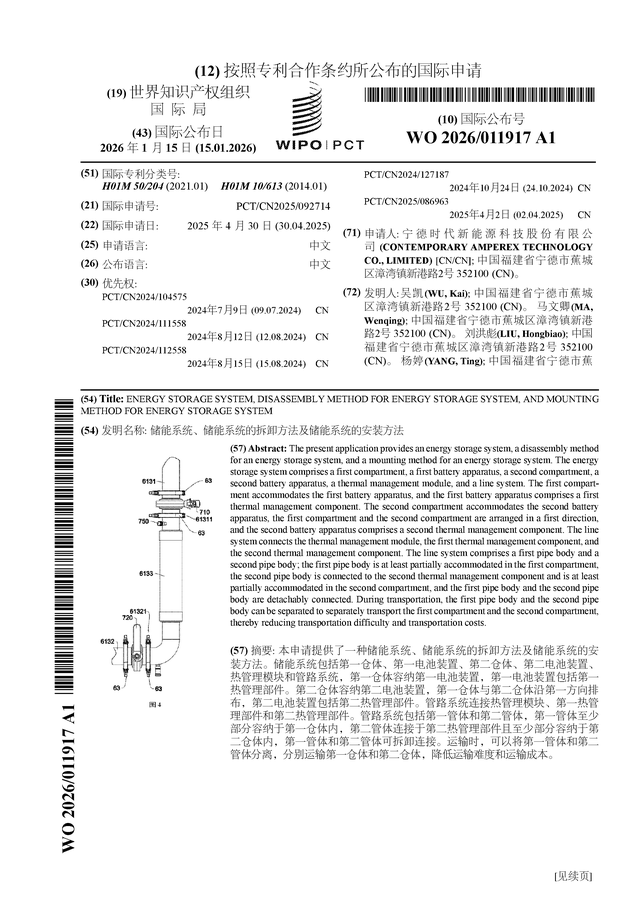 证券之星消息,根据企查查数据显示宁德时代(300750)公布了一项国际专利申请,专利名为“储能系统、储能系统的拆卸方法及储能系统的安装方法”,专利申请号为PCT/CN2025/092714,国际公布日为2026年1月15日。