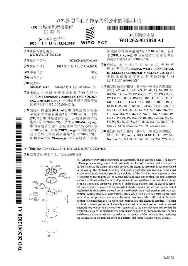 证券之星消息,根据企查查数据显示宁德时代(300750)公布了一项国际专利申请,专利名为“电池单体、电池及用电设备”,专利申请号为PCT/CN2025/099393,国际公布日为2026年1月15日。