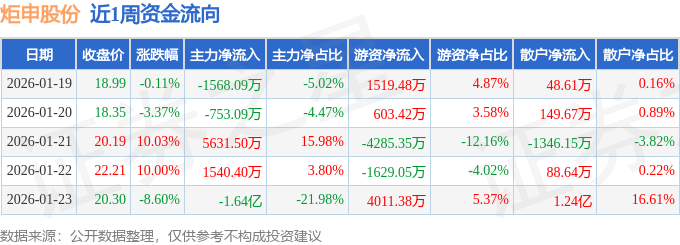 资金流向数据方面,本周炬申股份主力资金合计净流出1.16亿元,游资资金合计净流入219.89万元,散户资金合计净流入1.13亿元。本周资金流向一览见下表: