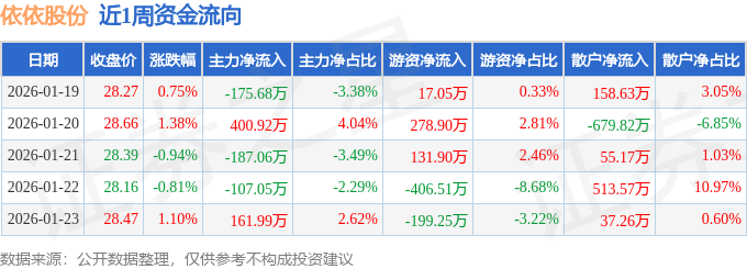 资金流向数据方面,本周依依股份主力资金合计净流入93.11万元,游资资金合计净流出177.91万元,散户资金合计净流入84.8万元。本周资金流向一览见下表: