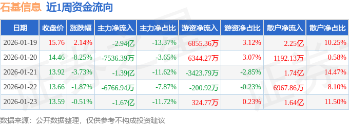 资金流向数据方面,本周石基信息主力资金合计净流出7.43亿元,游资资金合计净流入9899.68万元,散户资金合计净流入6.44亿元。本周资金流向一览见下表: