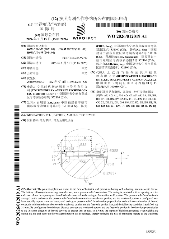 证券之星消息,根据企查查数据显示宁德时代(300750)公布了一项国际专利申请,专利名为“电池单体、电池及用电设备”,专利申请号为PCT/CN2025/099392,国际公布日为2026年1月15日。
