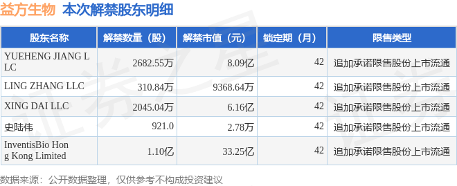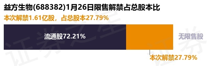 证券之星消息,根据市场公开信息整理,益方生物(688382)于1月26日将有1.61亿股限售股份解禁,为公司追加承诺限售股份上市流通,占公司总股本27.79%。(本次数据根据历史公告整理得出,实际情况以上市公司最新公告为准)最近一年内,该股累计解禁1631.47万股,占总股本的2.82%。本次解禁后,公司已无限售股份。具体如下图所示: