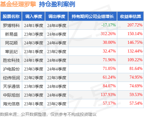 罗擎管理的东财数字经济A基金在24年1季度买入罗博特科,在持有3个季度后在24年4季度卖出。持有期间的估算收益率为207.72%,持有期间罗博特科在2023年到2024年的年报归属净利润降幅为17.17%。