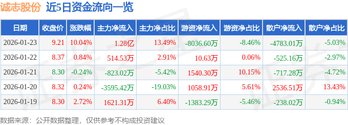 证券之星消息,截至2026年1月23日收盘,诚志股份(000990)报收于9.21元,上涨10.04%,涨停,换手率8.66%,成交量105.28万手,成交额9.5亿元。