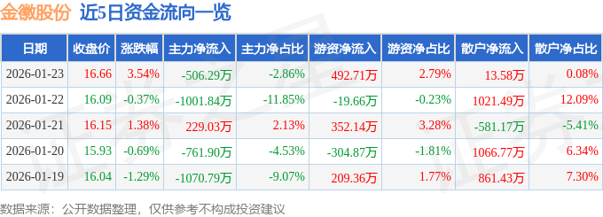 1月23日的资金流向数据方面,主力资金净流出506.29万元,占总成交额2.86%,游资资金净流入492.71万元,占总成交额2.79%,散户资金净流入13.58万元,占总成交额0.08%。