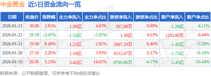 1月23日的资金流向数据方面,主力资金净流入1.26亿元,占总成交额4.03%,游资资金净流入267.08万元,占总成交额0.09%,散户资金净流出1.28亿元,占总成交额4.11%。