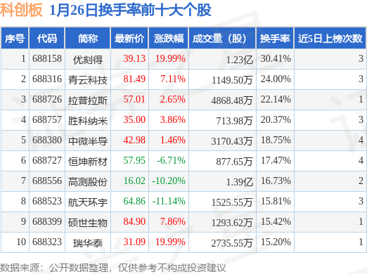 当日科创板换手率前10大个股中7只个股收涨,平均涨幅8.99%,其中优刻得(688158)以换手率30.41%排第一,7只个股近5个交易日中多次上榜。