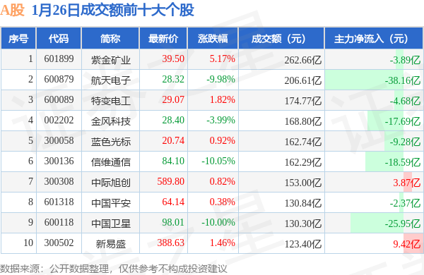 当日A股成交额前10大个股中6只个股收涨,平均涨幅1.76%,其中紫金矿业(601899)以成交额262.66亿元排第一。从主力资金流入看,成交额前10大个股中有2只个股呈现主力资金净流入。