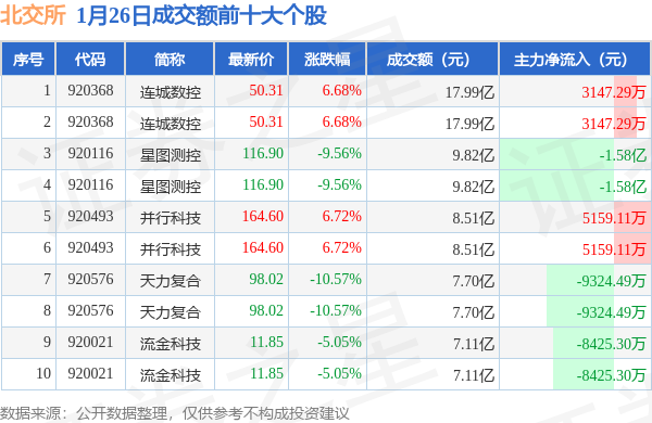 当日北交所成交额前10大个股中4只个股收涨,平均涨幅6.7%,其中连城数控(920368)以成交额17.99亿元排第一。从主力资金流入看,成交额前10大个股中有4只个股呈现主力资金净流入。