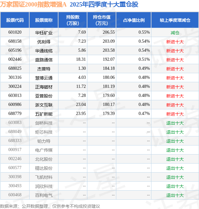 万家国证2000指数增强A的前十大重仓股如下: