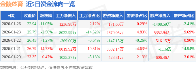 证券之星消息,截至2026年1月26日收盘,金陵体育(300651)报收于22.94元,下跌11.05%,换手率29.14%,成交量25.48万手,成交额5.84亿元。