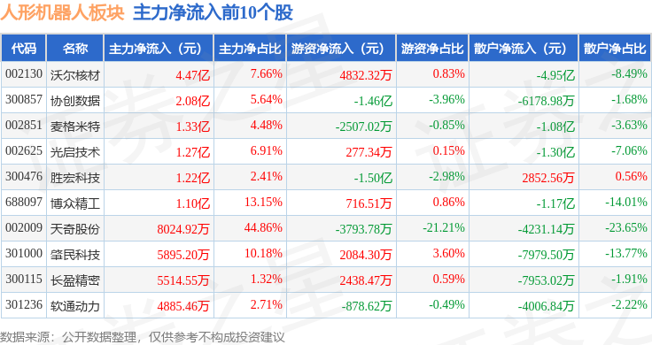 从资金流向上来看,当日人形机器人板块主力资金净流出157.23亿元,游资资金净流入29.36亿元,散户资金净流入127.87亿元。人形机器人板块个股资金流向见下表: