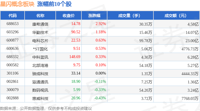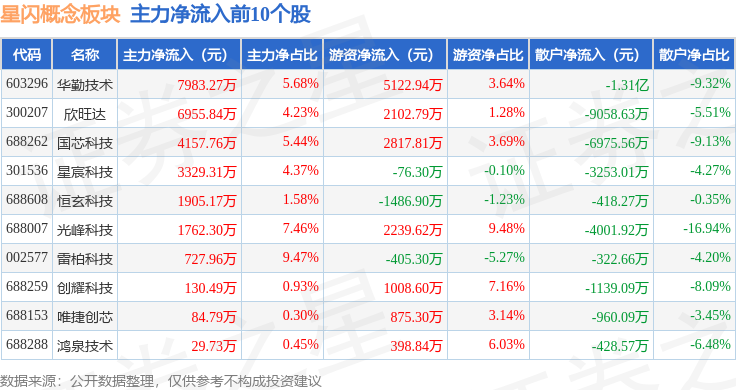 从资金流向上来看,当日星闪概念板块主力资金净流出61.26亿元,游资资金净流入23.6亿元,散户资金净流入37.66亿元。星闪概念板块个股资金流向见下表: