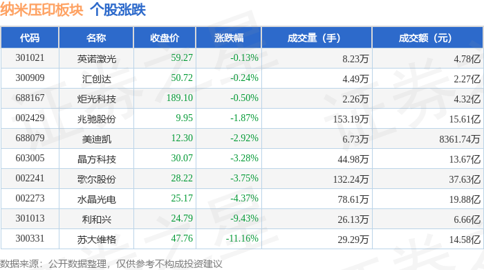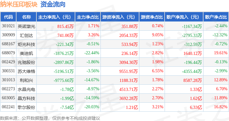 从资金流向上来看,当日纳米压印板块主力资金净流出13.15亿元,游资资金净流入3.73亿元,散户资金净流入9.42亿元。纳米压印板块个股资金流向见下表: