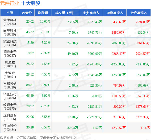 个股表现方面,元件行业当日领跌股为天津普林(002134),该股当日报收25.02,下跌10.0%,成交量23.05万,主力资金净流出6025.43万元。高华科技(688539)以下跌9.16%紧随其后,该股当日成交量7.5万,主力资金净流出1747.73万元。除此之外,骏亚科技(603386)、铜峰电子(600237)、奥迪威(920491)均进入当日熊股之列。具体个股列表见下表: