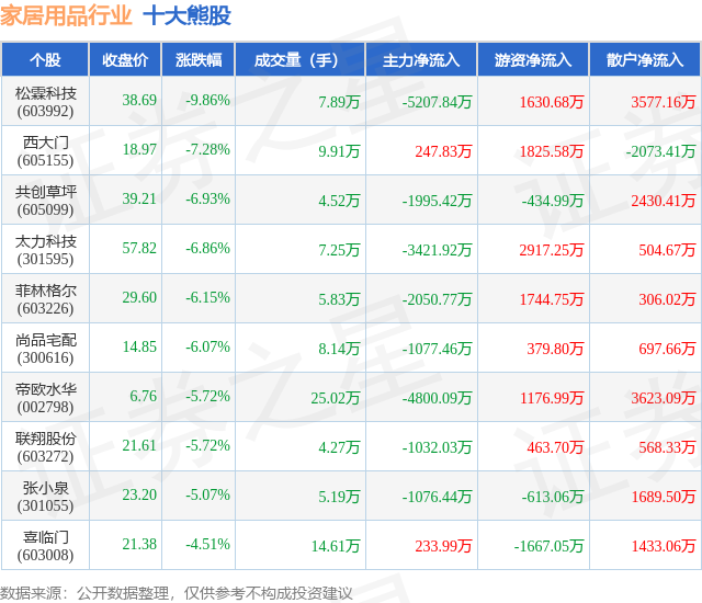 个股表现方面,家居用品行业当日领跌股为松霖科技(603992),该股当日报收38.69,下跌9.86%,成交量7.89万,主力资金净流出5207.84万元。西大门(605155)以下跌7.28%紧随其后,该股当日成交量9.91万,主力资金净流入247.83万元。除此之外,共创草坪(605099)、太力科技(301595)、菲林格尔(603226)均进入当日熊股之列。具体个股列表见下表: