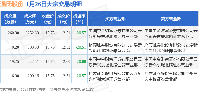 证券之星消息,1月26日温氏股份发生大宗交易,交易数据如下: