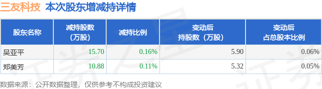 证券之星消息,1月26日三友科技发布公告《三友科技:关于控股股东、实际控制人及其一致行动人权益变动触及1%整数倍的提示性公告》,其股东吴亚平、郑美芳于2025年11月11日至2026年1月23日间合计减持26.57万股,占公司目前总股本的0.2629%,变动期间该股股价下跌0.27%,截止1月23日收盘报18.31元。