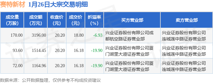 证券之星消息,1月26日赛特新材发生大宗交易,交易数据如下:
