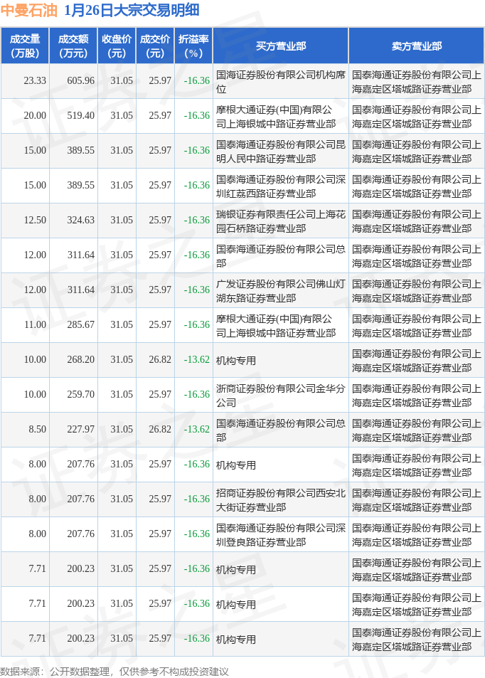 证券之星消息,1月26日中曼石油发生大宗交易,交易数据如下:
